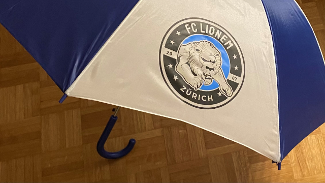 - Ebenfalls erhältlich sind grosse Regenschirme mit dem FC Lionem Zürich Logo für CHF 200.-